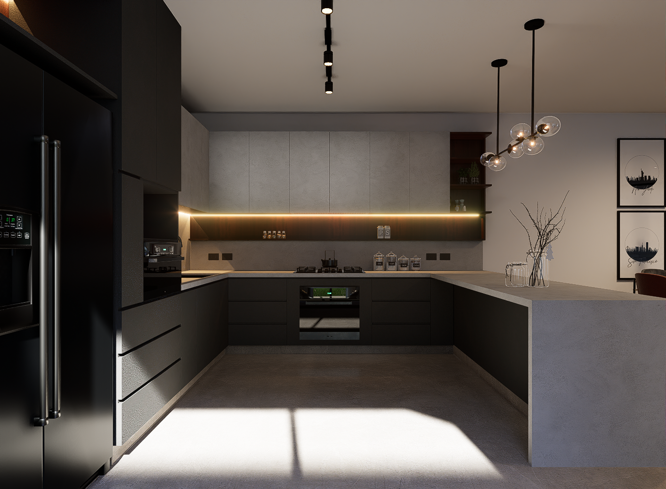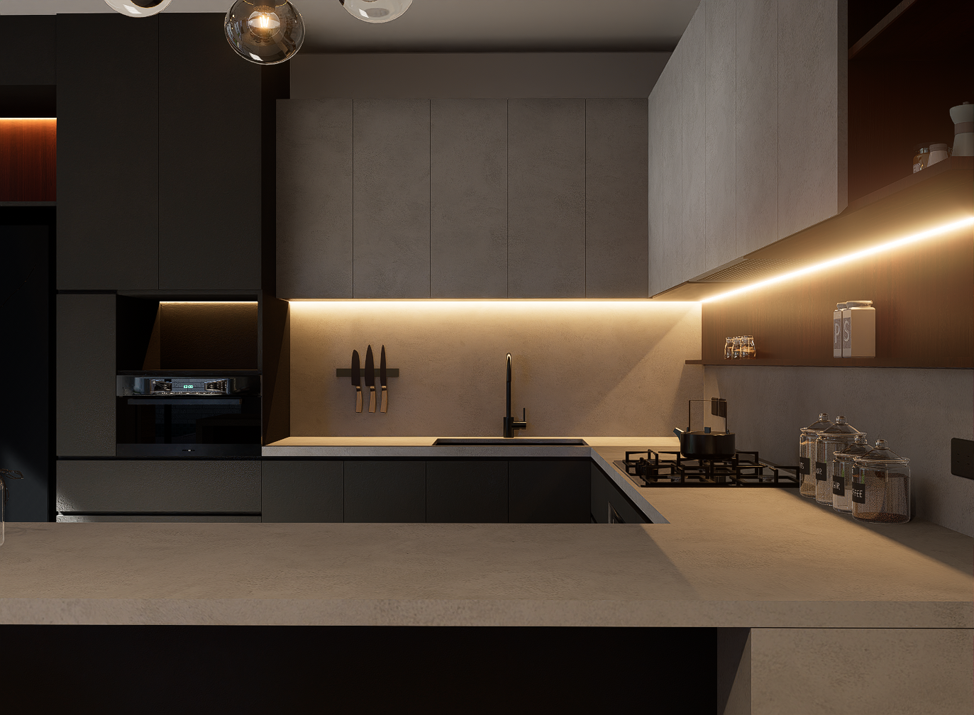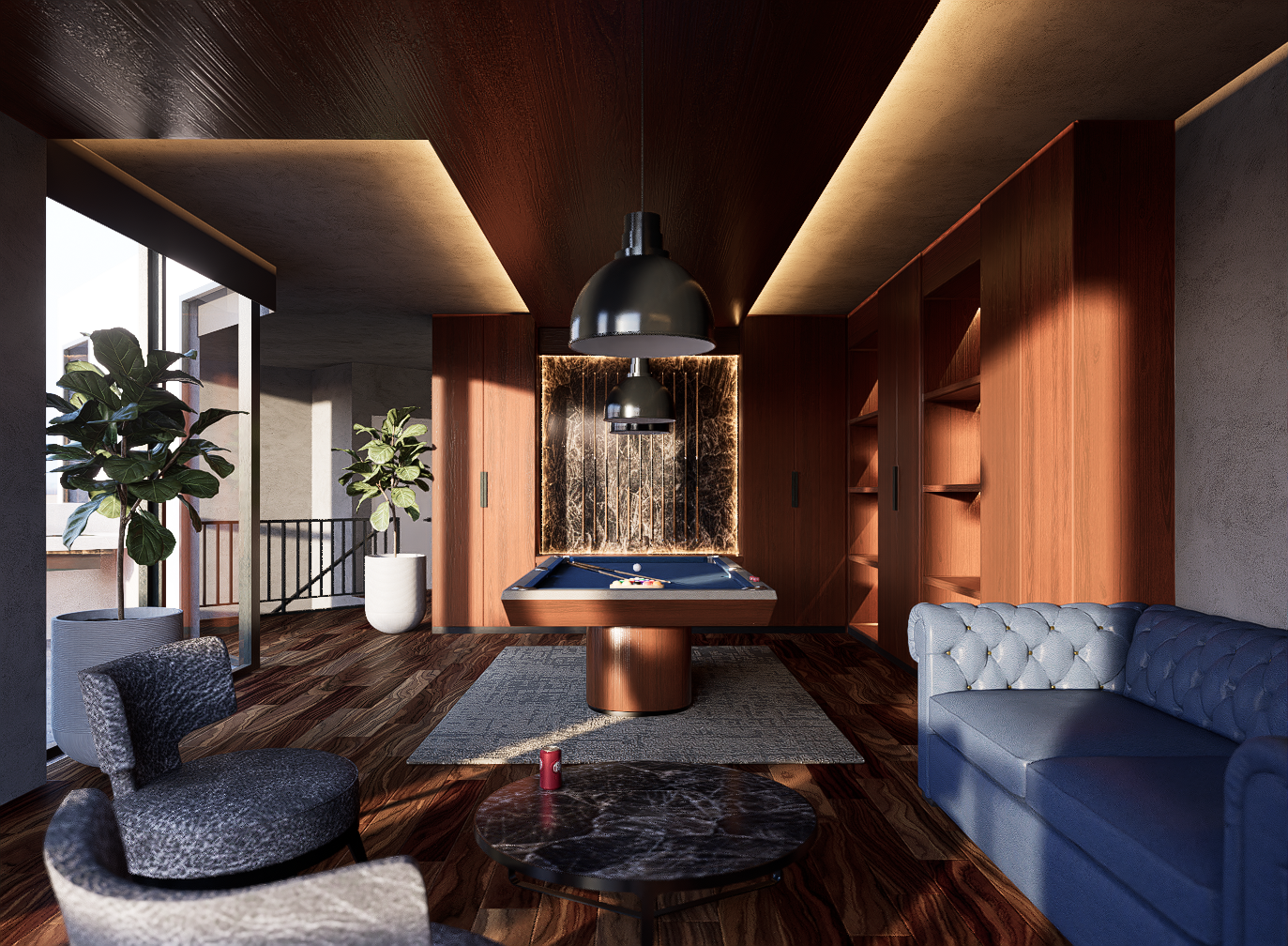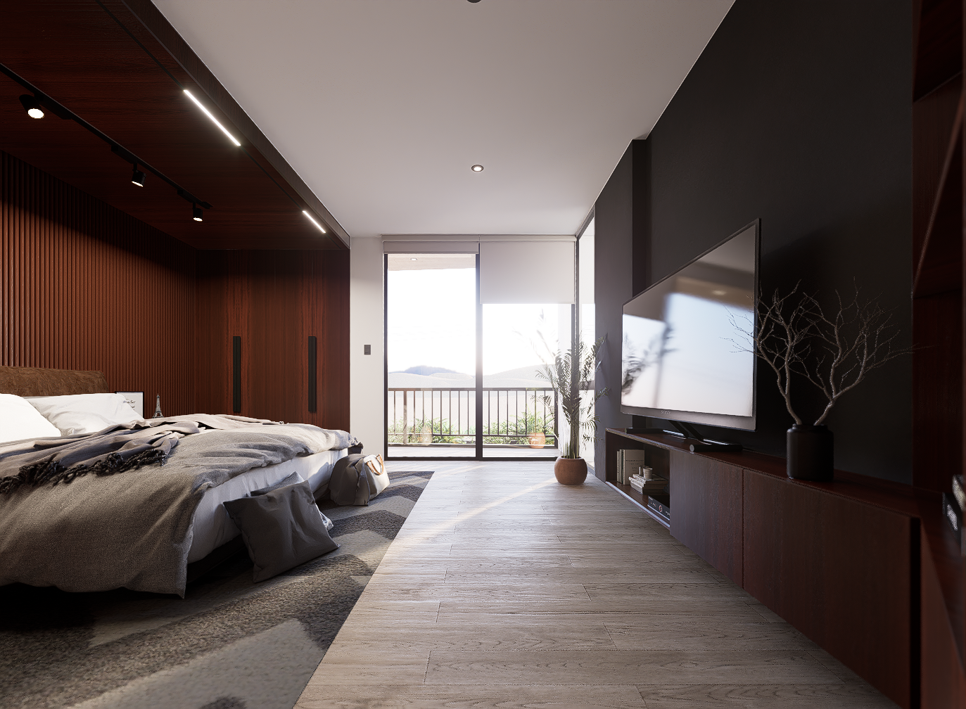 La fachada se desarrolló controlando el ingreso de la luz mediante una proporción igual de muros opacos y vanos. Los balcones se abren hacia el exterior en ángulos obtusos,  amplificando asi la visibilidad del paisaje desde el interior. Sobriedad, calidez e iluminación, consideraciones primordiales para nuestro cliente, transformando estos requerimientos a la hora de proyectar en: minimalismo, uso de look madera y apertura de vanos, respectivamente.